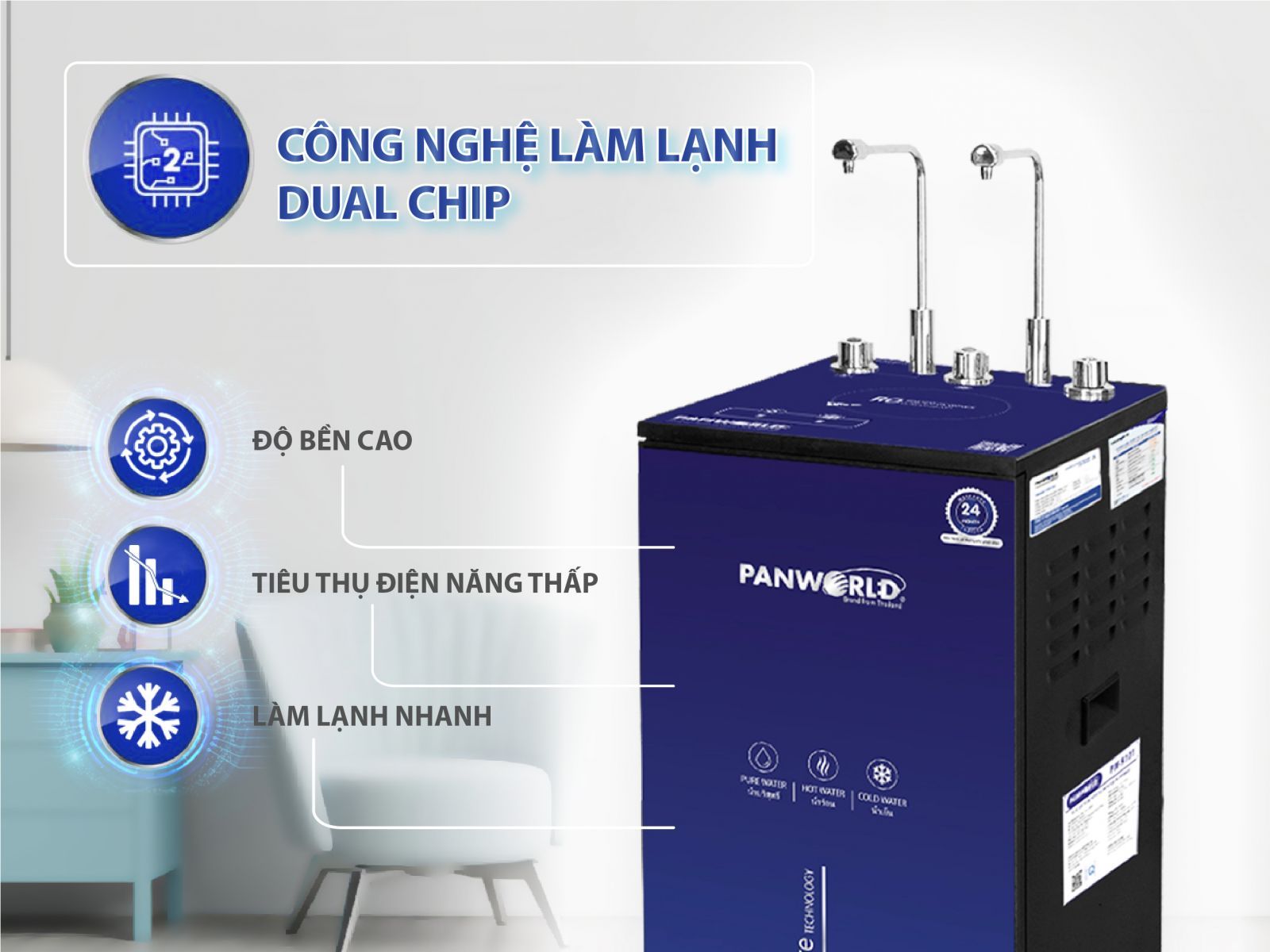 Công nghệ Dual Chip làm lạnh sâu và nhanh. Công suất làm lạnh đạt: 2L/h, Công suất làm nóng: 6L/h